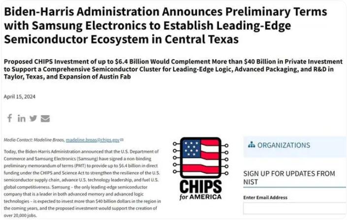 - 當(dāng)?shù)貢r(shí)間周一,美國(guó)商務(wù)部國(guó)家標(biāo)準(zhǔn)及技術(shù)研究所官網(wǎng)貼出聲明,宣布與韓國(guó)三星電子達(dá)成一項(xiàng)初步協(xié)議,依據(jù)美國(guó)《芯片法案》提供至多64億美元的直接補(bǔ)貼。來源:NIST 作