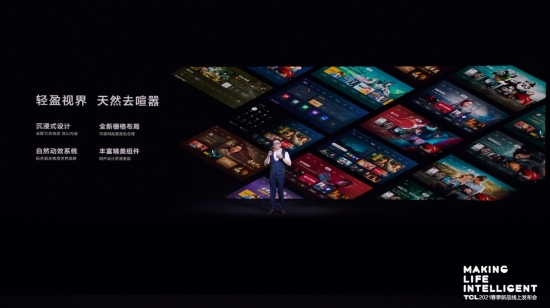 為了解決電視信息冗余、功能單調、操作單一等問題,TCL C12 量子點 Mini LED 智屏搭載了全新的UI5.0。在設計上 UI5.0 堅持 UI 服務于內容,交互服務于體驗。全新 UI 5.0 采用沉浸式設計,將內容本身作為全屏背景,去除冗余的信息和符號,讓用戶聚焦于核心內容,給予用戶更為輕松極致的場景體驗。
