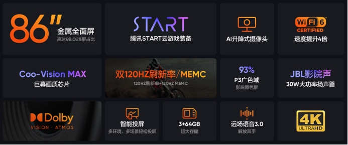 根據(jù)發(fā)布會(huì)上的信息,酷開電視Max86搭載了86英寸金屬全面屏巨幕、120Hz刷新率+120Hz MEMC、WI-FI 6、內(nèi)置升降式攝像頭、遠(yuǎn)場(chǎng)語音和光學(xué)防藍(lán)光等高階配置,同時(shí)內(nèi)置騰訊START云游戲、將產(chǎn)品的各項(xiàng)“潮玩力”屬性極致呈現(xiàn),引起科技潮人和業(yè)內(nèi)人士的關(guān)注。