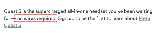 我們還在官方新聞中找到一些比較有趣的句子,看到了Meta和蘋果之間若有若無的火藥味。比如說,Meta特定用破折號表示的“無線”和一體機設計以及強調(diào)為未來的頭顯設立新的標桿等。