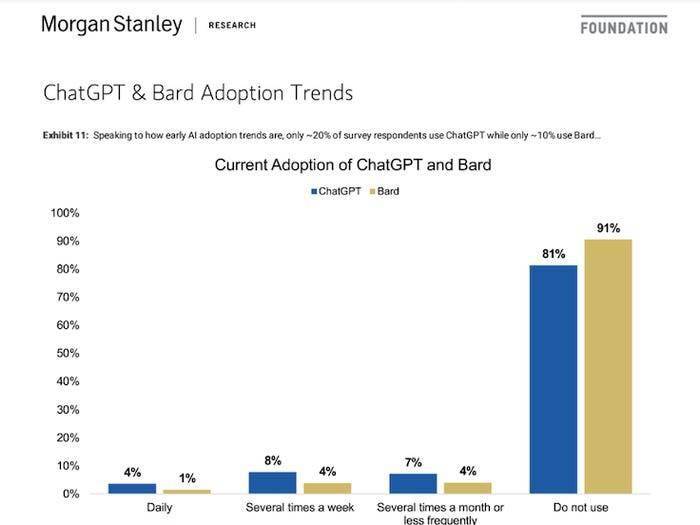摩根士丹利的分析師們寫道:“投資者們需要明白,這還是一個非常早期的階段。”他們認為,目前人們主要使用聊天機器人來了解一些新的話題,而那些可以產生商業價值的使用場景還很遙遠。例如,在網上購物、比較價格和選購商品時,使用聊天機器人的用戶比例還很低,這些場景可以為企業帶來廣告收入。