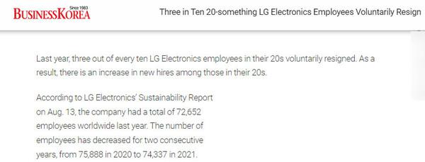 去年,LG 電子 20 多歲的人自愿辭職率為 29.9%。11676 名 20 多歲的正式員工中,有 3492 人離開了公司。與 30 多歲和 40 多歲的員工相比,20 多歲的自愿辭職率高出數倍。