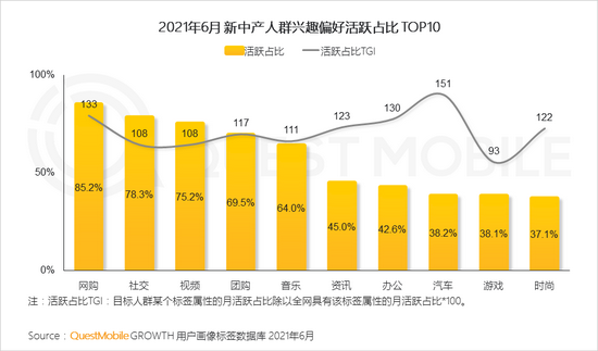 處于同一年齡時期的新中產人群較80、90后總體人群,在房產、汽車、出行等方面,具有更高的消費需求,經濟活躍度更為突出。他們同時擁有廣泛的興趣偏好,尤其在汽車、網購、辦公等領域具有較高群體傾向,突顯出他們家庭、事業多元成長的人生狀態,豐富的消費需求和廣泛的社交需要進一步加深他們對于網購和社交的使用,而在視頻娛樂方面則有所放緩。