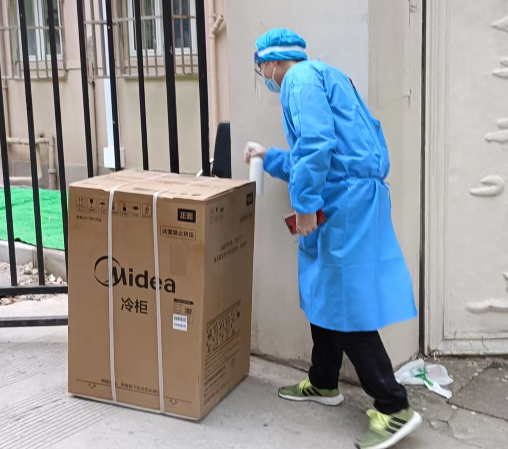 黃女士嘗試聯系了多家網購平臺以及電器賣場,都被告知無法送貨。經朋友介紹,4月7日黃女士聯系到了蘇寧易購浦東一家門店的店長,經過溝通后,該店長表示,次日便可安排送貨。第二日下午,身穿防護服的蘇寧易購物流人員,將冰箱送到了黃女士小區門口,對貨品進行消毒后通知黃女士下樓取件。