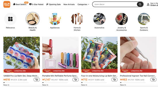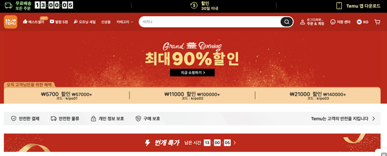 打開Temu剛剛上線的韓國站,首頁置頂跳動的字符直接告訴用戶——已經“砍”掉了商品原價的90%。在這里,你可以用500韓元(約2.8元)左右的價格買一個針線包,也可以花不到2萬韓元(約110元)買一個空調扇。
