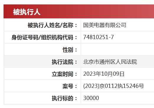 【家電資訊-家電新聞 - 渠道資訊,作者:編輯】中國執行信息公開網顯示,10月9日-10日,國美電器有限公司新增4條被執行人信息,執行標的合計約1.55億元。