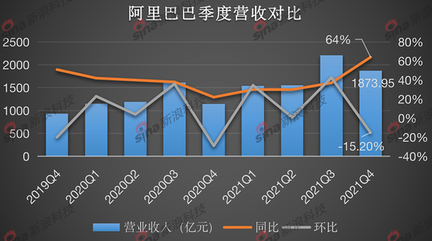 第四季度,阿里巴巴營收為1873.95億元(約合286.02億美元),同比增長64%,高于彭博分析師預期的1803.97億元。若不考慮合并高鑫零售的影響,同比增速為40%。