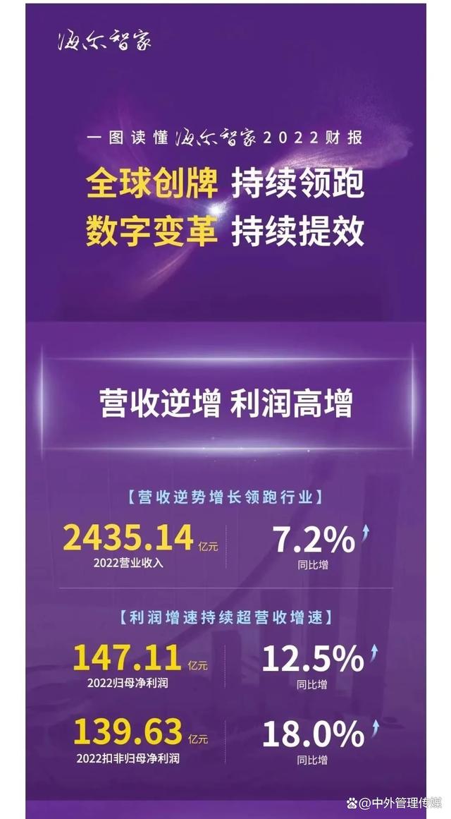 - 海爾智家2022年財報:營收2435億元 同比增長7.2% 扣非歸母凈利潤增長18%