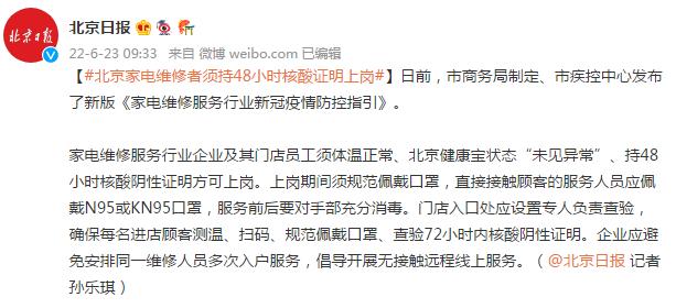 【劃重點】: 日前,市商務局制定、市疾控中心發布了新版《家電維修服務行業新冠疫情防控指引》?! 〖译娋S修服務行業企業及其門店員工須體溫正常、北京健康寶狀態“未見異常”、持48小時