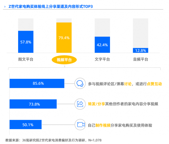 調(diào)研中我們發(fā)現(xiàn),79.4%用戶通過參與討論、點(diǎn)贊、彈幕、轉(zhuǎn)發(fā)視頻或創(chuàng)作視頻等互動(dòng),分享家電產(chǎn)品購買、使用體驗(yàn)。