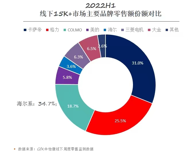 不過,從2022H1線下15k+市場主要品牌零售額份額對比來看,海爾系+卡薩帝獨占鰲頭,占據了將近50%的市場,格力以25.5%的市場份額,位居第二。美的則無愧“性價比”的標簽,銷售額甚至不及大金、三菱電機。