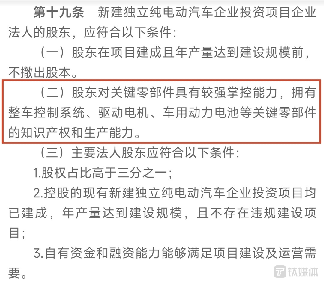 例如,第十九條第二項指出:“股東對關鍵零部件具有較強掌控力,擁有整車控制系統、驅動電機、車用動力電車等關鍵零部件的知識產權和生產能力”。反觀小米汽車的布局,其在研發端更側重于自動駕駛,在上游原材料、三電自研等領域則暫無大動作介入。