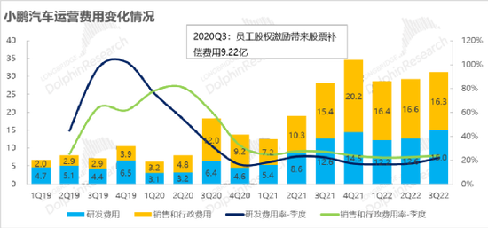 另一邊,汽車產品力弱于同行,小鵬不得不維持較高的營銷費用。為了快速向全國市場滲透,2021年小鵬開放了加盟模式(蔚來和理想全部直營),整體門店數呈現快速擴張的局面。但銷量在2022年呈現萎縮的態勢,使得運營成本無法分攤,2022年Q3顯示運營虧損率已經達到32%,虧了22個億。