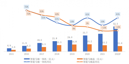 2015年吳曉波一篇“去日本背馬桶蓋”的文章引發中國社會關于消費升級的大討論,也讓中國消費者開始了解此類產品。至今的近8年間,我國消費者對于智能坐便器產品需求的不斷增加,隨著消費者對智能坐便器的產品認知越發清晰,對于生活品質要求越來越高,再加上疫情原因使得消費者更加注重健康生活習,多重因素的共同作用下,我國智能坐便器的市場規模正逐漸擴大。
