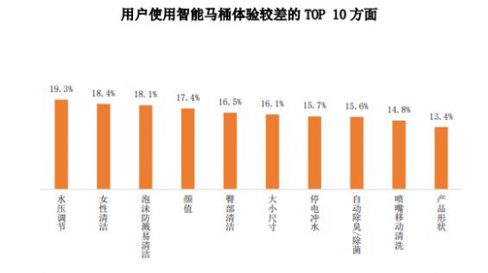 那么,當前消費者在使用智能坐便器過程中的痛點又有哪些呢?在選購時,他們又有哪些顧慮呢?據調研數據顯示,用戶在未來選購智能馬桶時,噴頭衛生、水質情況、停電沖水問題是用戶選購三大顧慮方面,占比均超過 50%。《報告》顯示,首先是智能馬桶的水壓調節問題,占比 19.3%,其次,女性清潔和泡沫防濺易清潔功能,占比分別為 18.4%、18.1%。