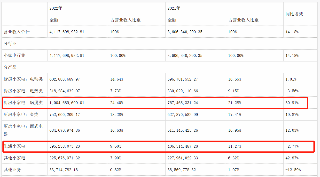 在財報中,小熊電器將其營收版圖拆分為廚房小家電、生活小家電、其他小家電和其他業務,廚房小家電又根據品類拆分為電動類、鍋煲類、壺類和西式電器類。這當中,廚房小家電仍是小熊電器主要收入來源,全年營收占比超過80%。