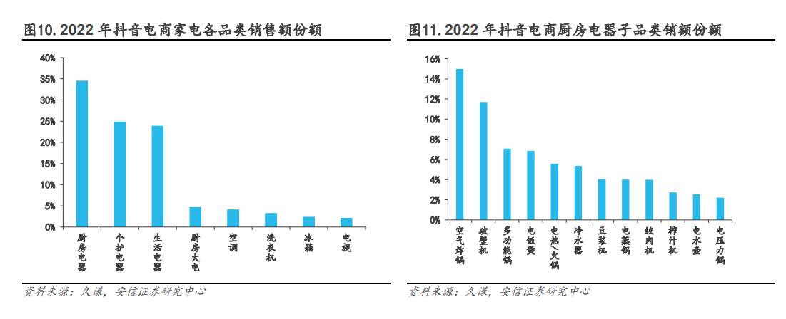 根據久謙數據的報告,2022年廚房小家電、個護電器和生活電器占抖音家電品類銷售額的比例均超過20%,比傳統白電、黑電更受歡迎。在已公布銷售成績的頭部品牌中,蘇泊爾在抖音平臺全年銷售額突破9億元,摩飛同樣在抖音直播間混得風生水起。