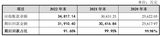 2020年-2022年,其應收賬款期后回款占比分別為99.98%、99.95%、91.65%。各報告期應壞賬準備分別為1742.39萬元、1535.81萬元、12911.42萬元。