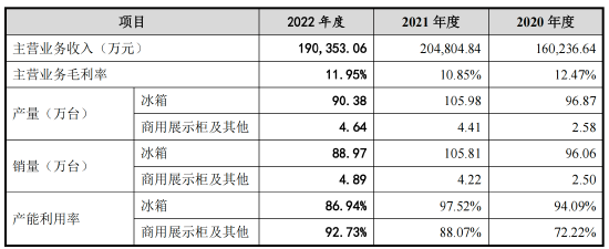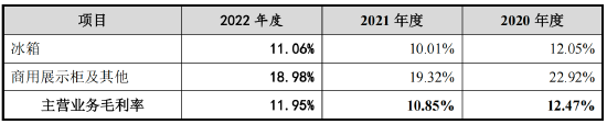 2020年-2022年,雪祺電氣營業收入分別為16.14億元、20.72億元、19.27億元,復合增長率為9.29%。其中主營業務,即來自于冰箱、商用展示柜的銷售占比維持在99%左右,而冰箱銷售占主營收入比分別為96.11%、90.93%、88.82%,正因如此,占比巨大的冰箱業務較低的毛利率也拖累了公司整體毛利率。