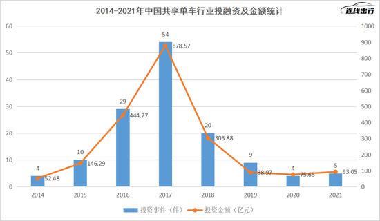 2014-2021年中國共享單車領域投資事件及投資金額統(tǒng)計,數(shù)據(jù)來源于觀研報告網(wǎng),連線出行制圖