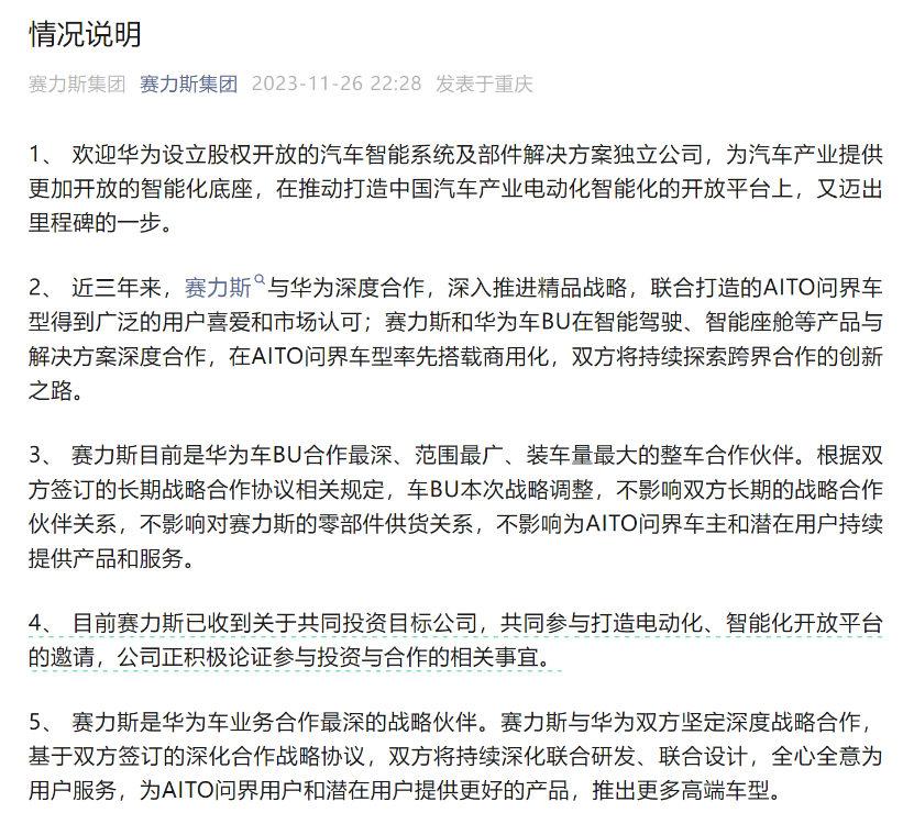 華為重磅宣布成立汽車智能系統(tǒng)及部件解決方案新公司、以及長(zhǎng)安選擇出資參投后,賽力斯在11月26日深夜也對(duì)外宣布,已收到關(guān)于共同投資目標(biāo)公司,并正積極論證參與投資與合作的相關(guān)事宜。