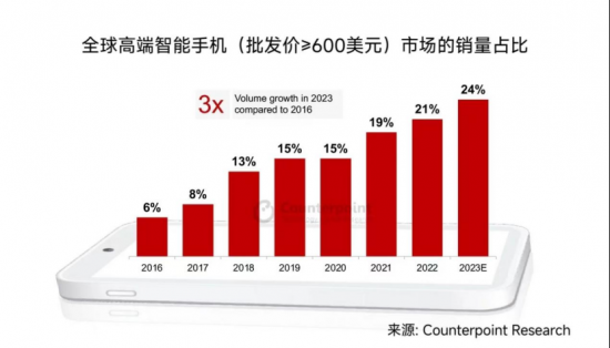 高端市場是最大的一項(xiàng)動力來源。綜合多方數(shù)據(jù)來看,高端智能手機(jī)是整個行業(yè)中唯一逆勢增長的細(xì)分領(lǐng)域。根據(jù)Counterpoint Research數(shù)據(jù),高端市場預(yù)計將占2023年全球智能手機(jī)市場銷量近四分之一,收入占60%。