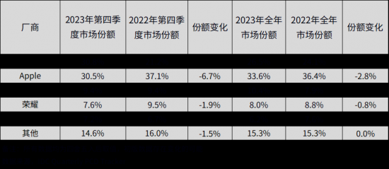同時,2023 年第四季度,華為超過蘋果成為中國平板電腦市場出貨量第一。IDC 數據顯示華為曾在 2019 年 Q3 - 2020 年 Q1 實現過第一,不過后續又被蘋果反超回去,如今再次超越蘋果。