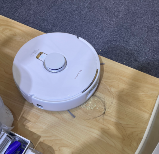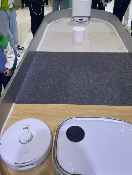 在展臺(tái)的顯眼位置設(shè)置有云鯨掃地機(jī)器人J4的演示區(qū),展臺(tái)材質(zhì)特別設(shè)置為家庭中常見的地板、地毯和瓷磚等材質(zhì)。工作人員在向參展觀眾介紹云鯨掃拖機(jī)器人J4搭載的創(chuàng)新技術(shù),拿出了準(zhǔn)備好的頭發(fā)、食品殘?jiān)M(jìn)行清掃模擬,給觀眾更直觀的清掃效果展示。