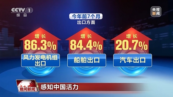 今年前7個月,出口方面,風力發電機組、船舶、汽車出口增速較快,分別增長86.3%、84.4%、20.7%。進口方面,金屬礦砂進口量增加6.2%,能源產品進口量增加5.4%。