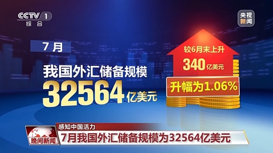 國家外匯管理局最新數據顯示,7月,我國外匯儲備規模為32564億美元,較6月末上升340億美元,升幅為1.06%,規模穩中有升。我國經濟運行延續回升向好態勢,有利于外匯儲備規模繼續保持基本穩定。