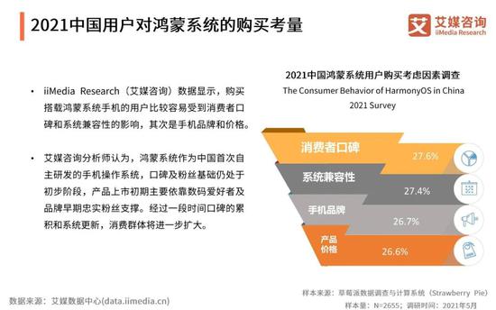 此前,艾媒咨詢發布的《2021年鴻蒙系統市場競爭力狀況與消費者行為調研報告》披露,購買搭載鴻蒙系統手機的用戶比較容易受到消費者口碑和系統兼容性的影響,其次是手機品牌和價格。艾媒咨詢分析師認為,經過一段時間口碑的累積和系統更新,其消費群體將進一步擴大。而鴻蒙系統快速推廣的核心因素是構建了可盈利的、繁榮的生態圈。