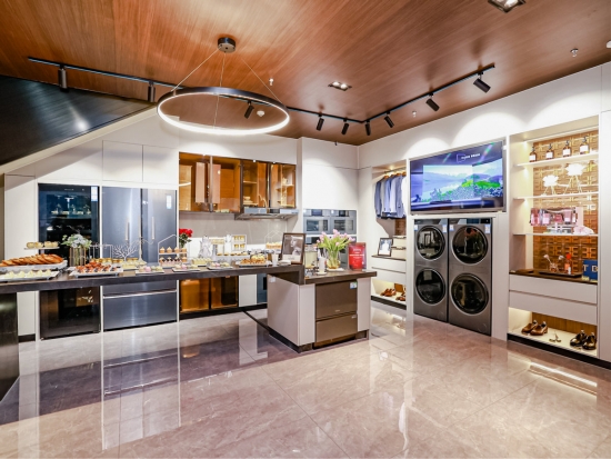 卡薩帝藝術(shù)生活館的整體結(jié)構(gòu)采用Loft設(shè)計(jì),它包含了“家”的真實(shí)場(chǎng)景。其中,下層為卡薩帝冰箱、洗衣機(jī)、空調(diào)、廚電、熱水器等高端產(chǎn)品打造的衣食住娛生活場(chǎng)景,上層則是智慧生活的會(huì)客廳,也是高端會(huì)員品鑒區(qū)。